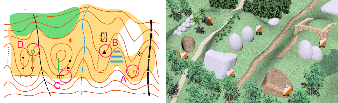 For most exercises, I envisaged a base scene with customisable elements – for instance a path might be swapped with a fence, or a thicket with a clearing – and then created a 3D model of this scene in Rhino3D in parallel with a map of the scene in CorelDraw v10.